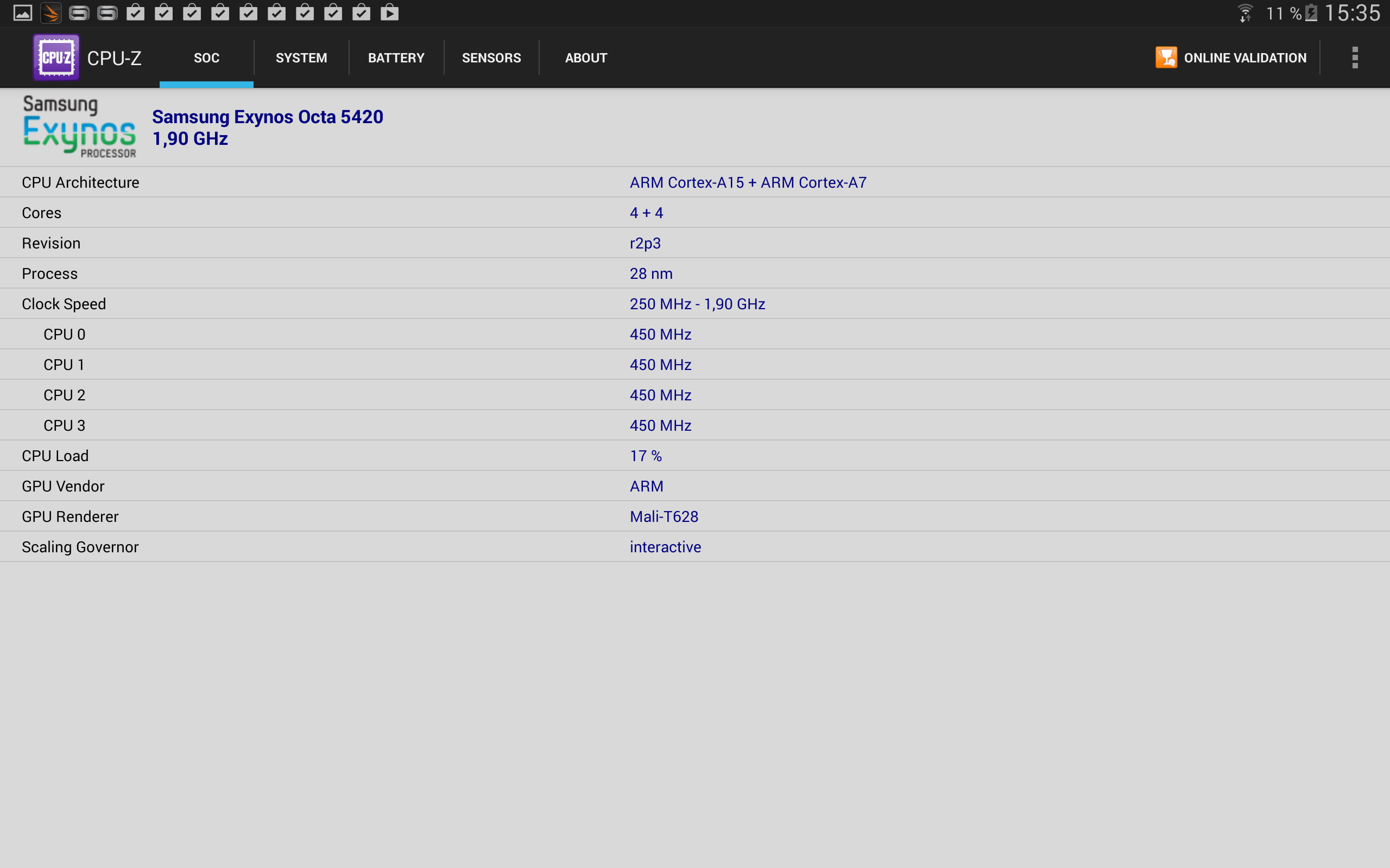 - SoC Exynos 5 Octa 5420 (4 ядра Cortex-A15 @1,9 ГГц и 4 ядра Cortex-A7 @1,3 ГГц)