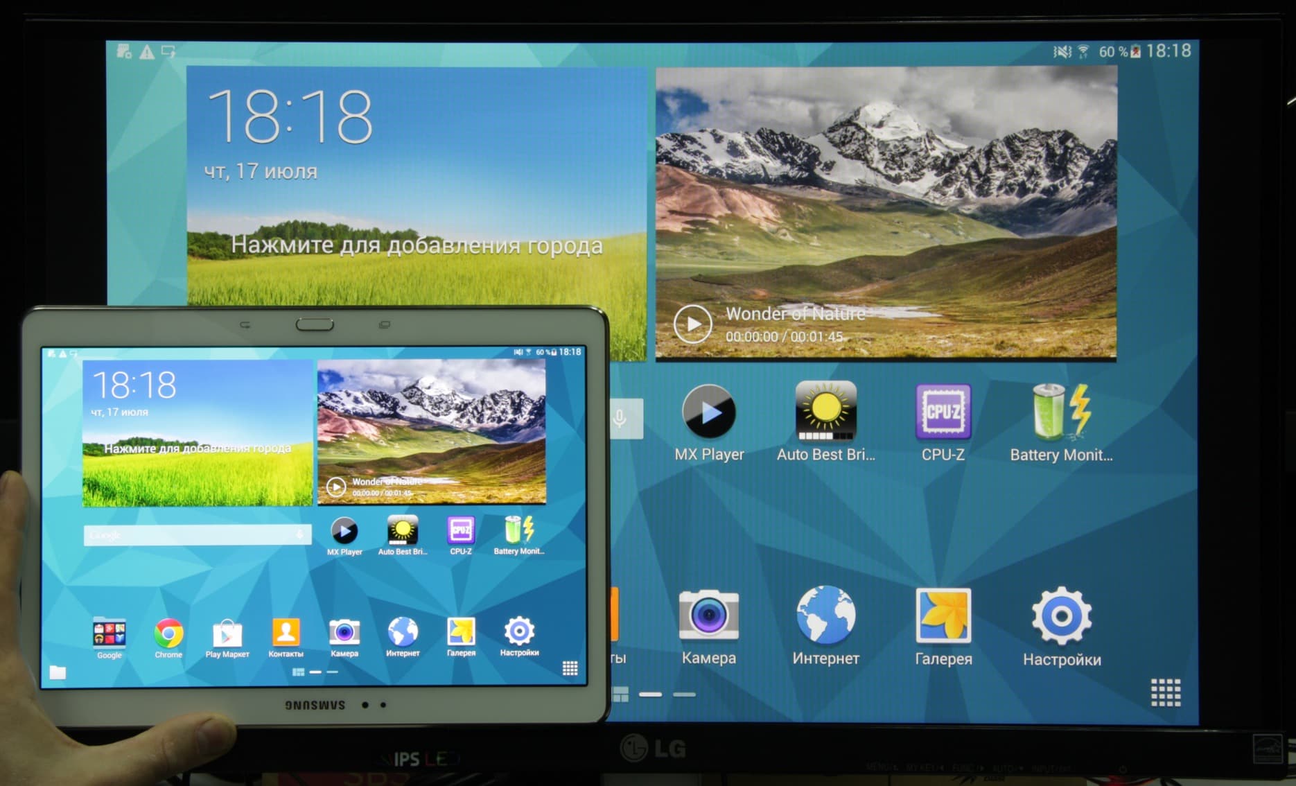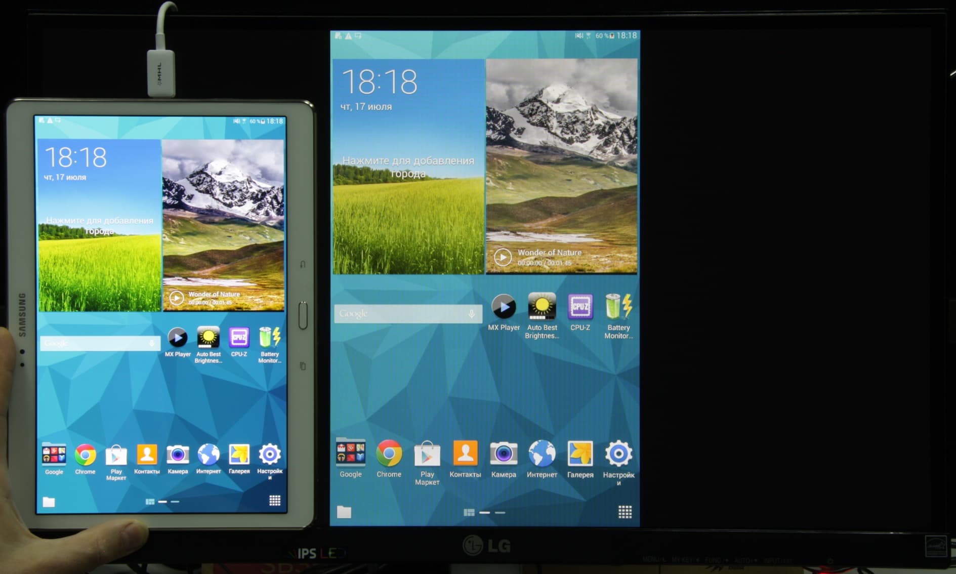 В данном случае тест мы проводили с помощью фирменного адаптера Samsung, при этом вывод по MHL осуществлялся в разрешении 1920 на 1080 пикселей с частотой 60 кадр/с. При портретной ориентации планшета вывод изображения на экран монитора осуществляется тоже в портретной ориентации, при этом изображение на мониторе вписано в границы экрана по высоте, а справа и слева выводятся широкие черные поля: