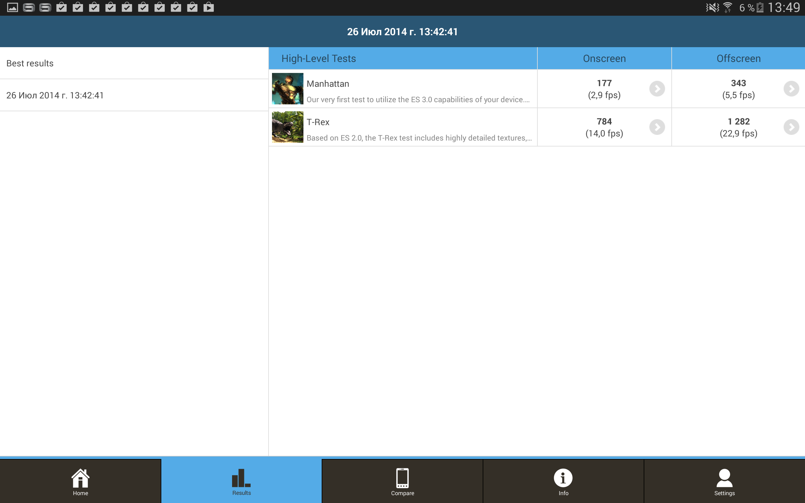 Здесь странная ситуация. Почему-то Epic Citadel определяет разрешение как 1280×800В — даже в режиме Ultra High Quality. И никакие настройки (все они стояли при тестах на максимум) не помогли нам это исправить. В итоге осталось загадкой, то ли картинка выводилась нормальная, а во время вывода результата почему-то появлялась ошибка, то ли уже при тестировании применялись неверные настройки. Так или иначе, в режиме Ultra High Quality тест выдавал 52,6 fps, что превосходный результат, если быть уверенным в том, что это действительно при разрешении 2560х1600. Но поскольку это вдвое превосходит результаты Galaxy Note 10.1 2014 Edition, то как раз есть уверенность в обратном: тест действительно работает некорректно. И все же внесем его результаты в таблицу.