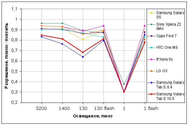 А здесь Samsung Galaxy Tab S 10.5 и вовсе оказался аутсайдером (наравне с Samsung Galaxy Note 10.1 2014 Edition, что вполне логично). Правда, отметим, что у планшетов Sony и Apple разрешение ниже, чем у планшетов Samsung и Asus, так что отчасти проигрыш Samsung можно объяснить этим.