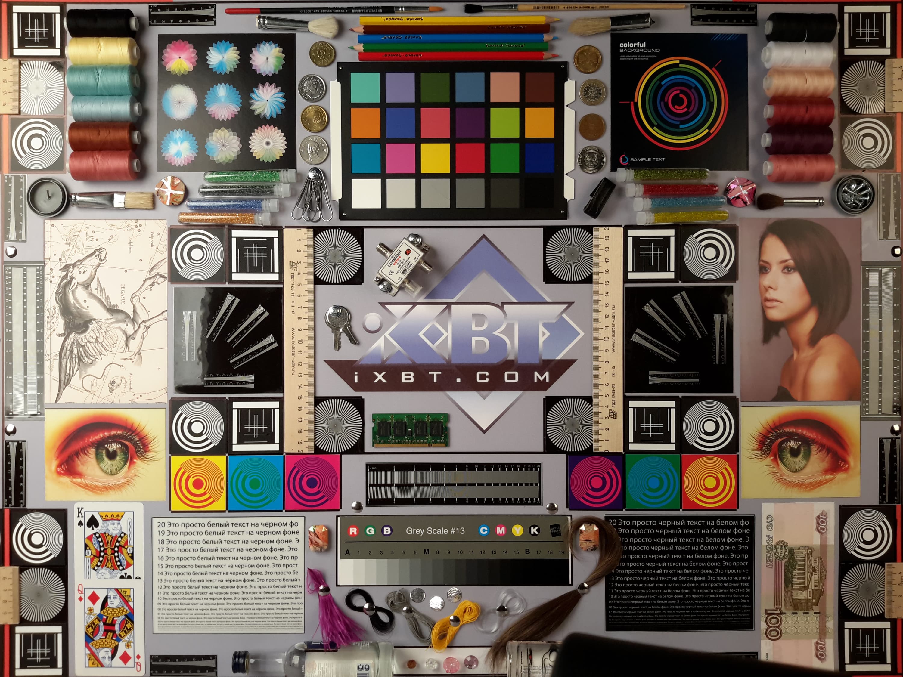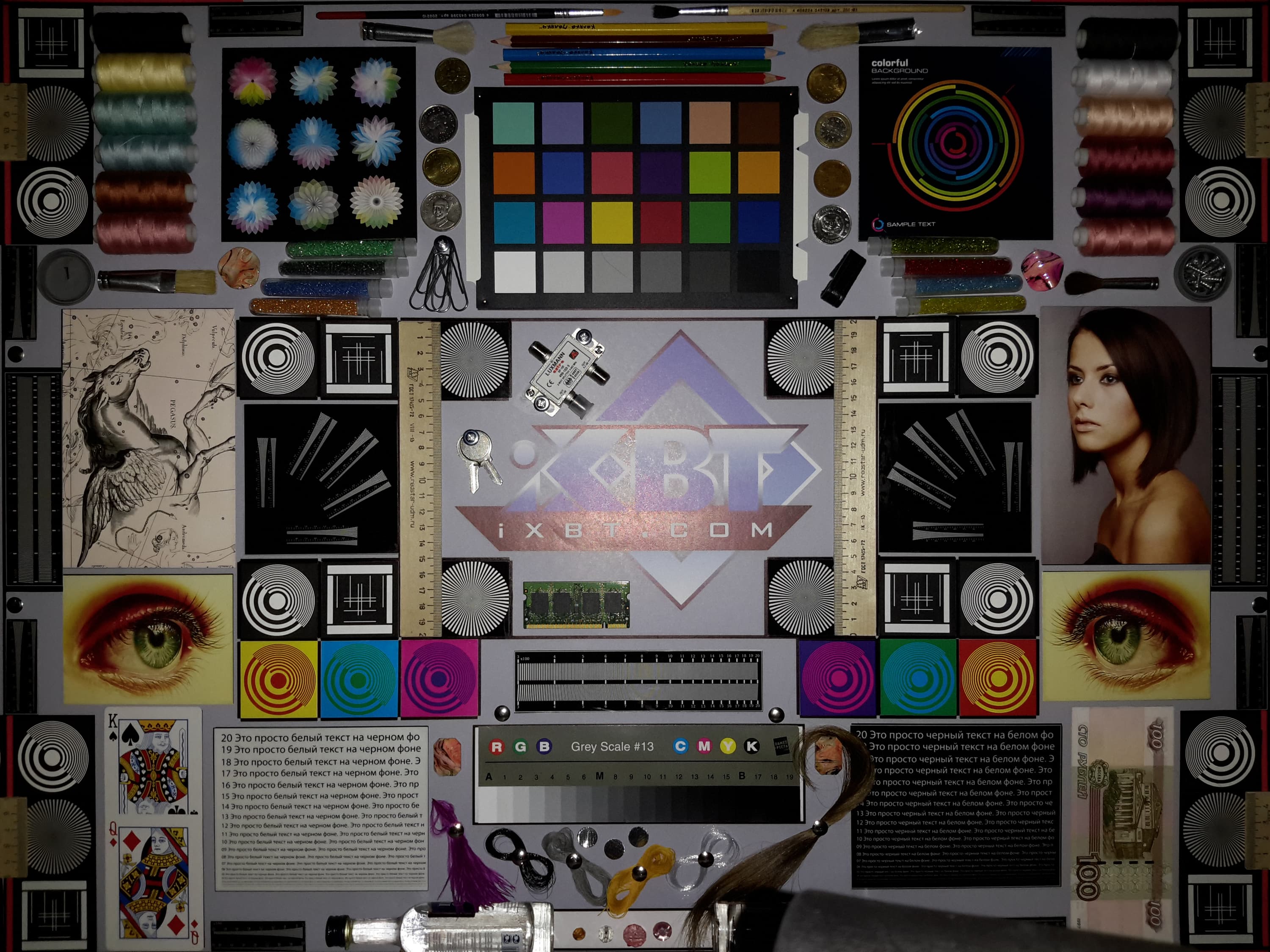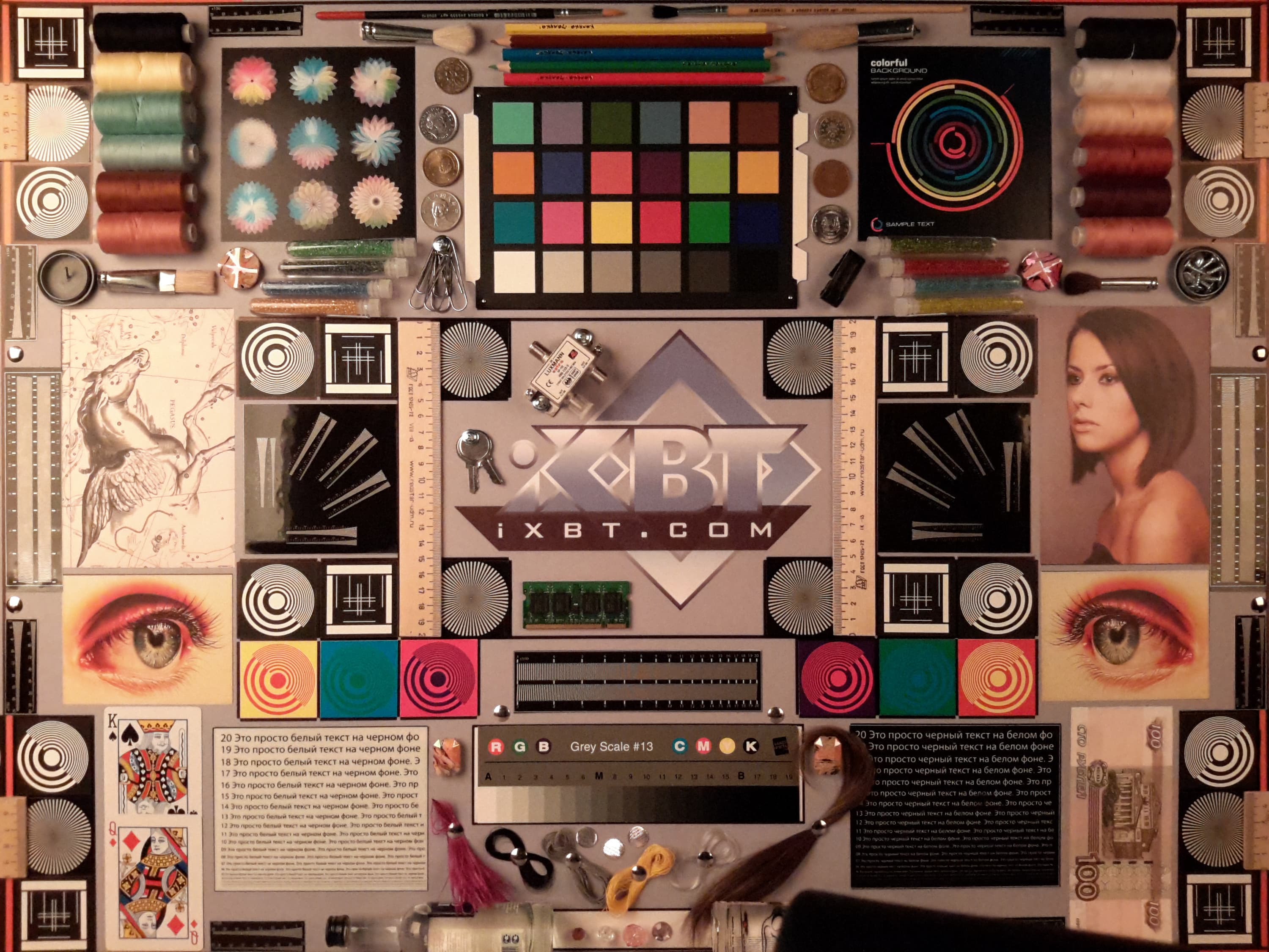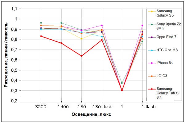 Яркость под углом у обоих экранов заметно уменьшилась (чтобы избежать сильного затемнения, выдержка увеличена в 2,5 раза в сравнении с предыдущими двумя фотографиями), но в случае Samsung падение яркости выражено гораздо меньше. В итоге при формально одинаковой яркости экран Galaxy Tab S 8.4 визуально выглядит гораздо более ярким (в сравнении с ЖК-экранами), так как на экран мобильного устройства часто приходится смотреть под небольшим углом. И тестовая картинка: