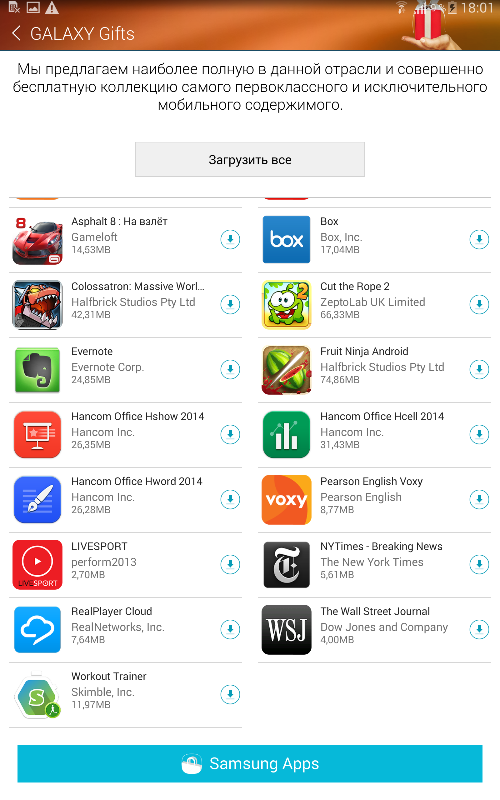 Помимо предустановленных приложений на планшете есть также специальный виджет Samsung Gifts, в котором собраны различные подарки, бесплатные подписки и прочие бонусы, которые получает покупатель планшета. В их числе: игры (Cut the Rope 2, Asphalt 8 с подарочной внутриигровой валютой, Fruit Ninja Android и др.), сервисы с онлайн-видео, западные СМИ, облачные сервисы Box и Dropbox с подарочным объемом памяти для хранения, а также ряд других приятных мелочей.