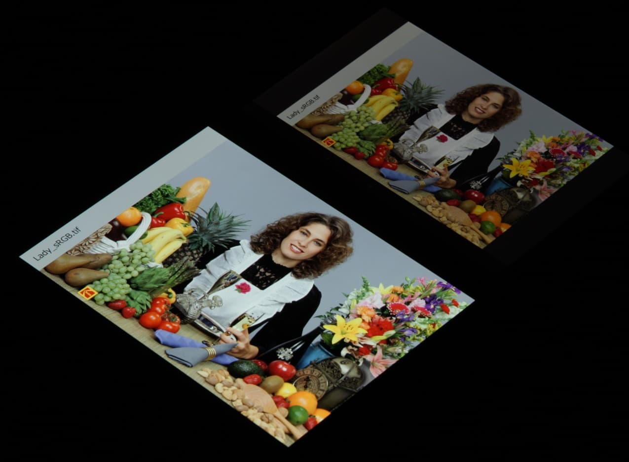 Экран характеризуется великолепными углами обзора, правда белый цвет при отклонении на большие углы приобретает легкий сине-зеленый оттенок, но черный цвет — просто черный под любыми углами. Настолько черный, что параметр контрастности в данном случае просто неприменим. При перпендикулярном взгляде равномерность белого поля отличная. Для сравнения приведем фотографии, на которых на экраны Galaxy Tab S 8.4 и второго участника сравнения выведены одинаковые изображения, при этом яркость экранов изначально установлена примерно на 200 кд/м², а цветовой баланс на фотоаппарате принудительно переключен на 6500 К.