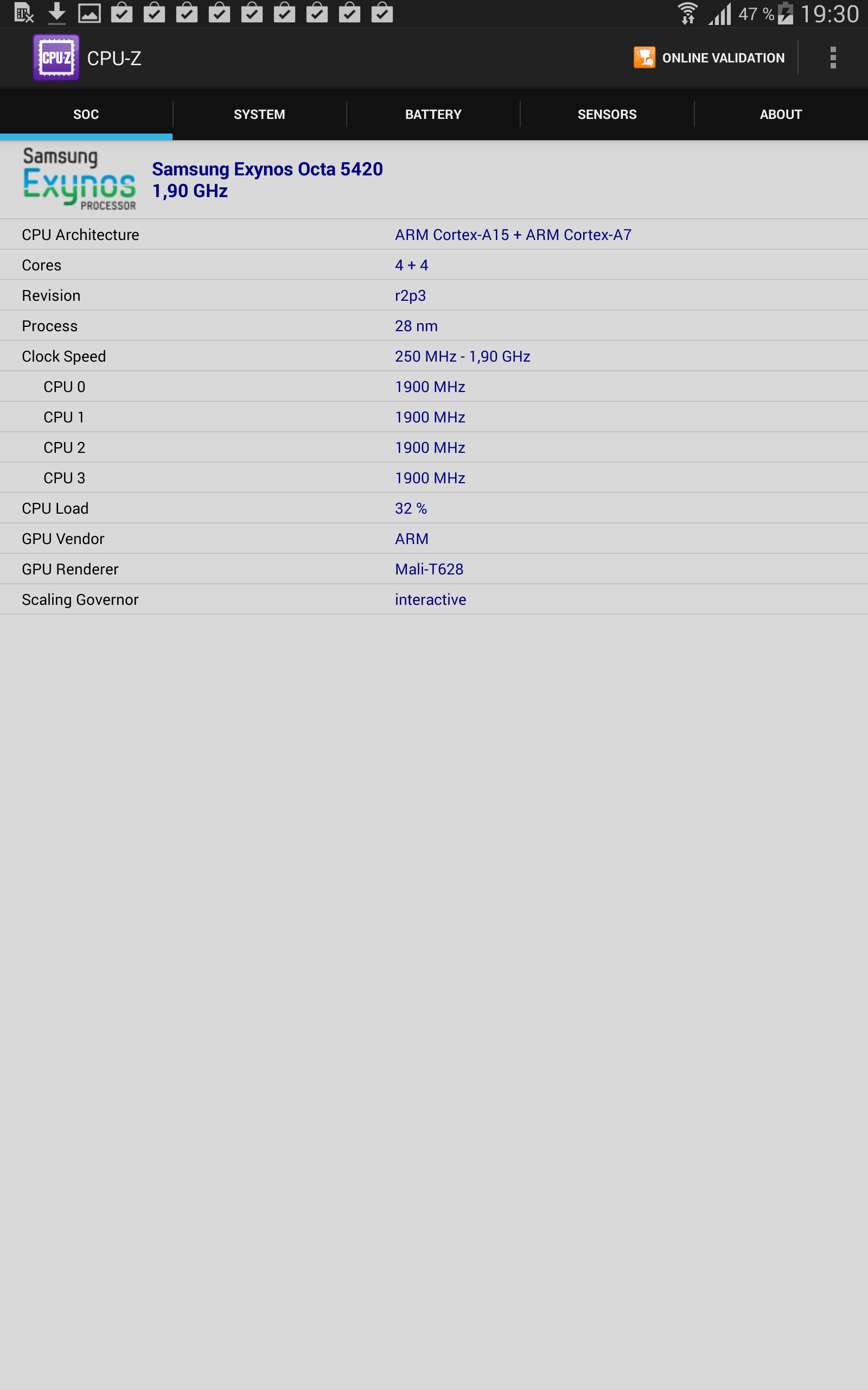 - SoC Exynos 5 Octa 5420 (4 ядра Cortex-A15 @1,9 ГГц и 4 ядра Cortex-A7 @1,3 ГГц)