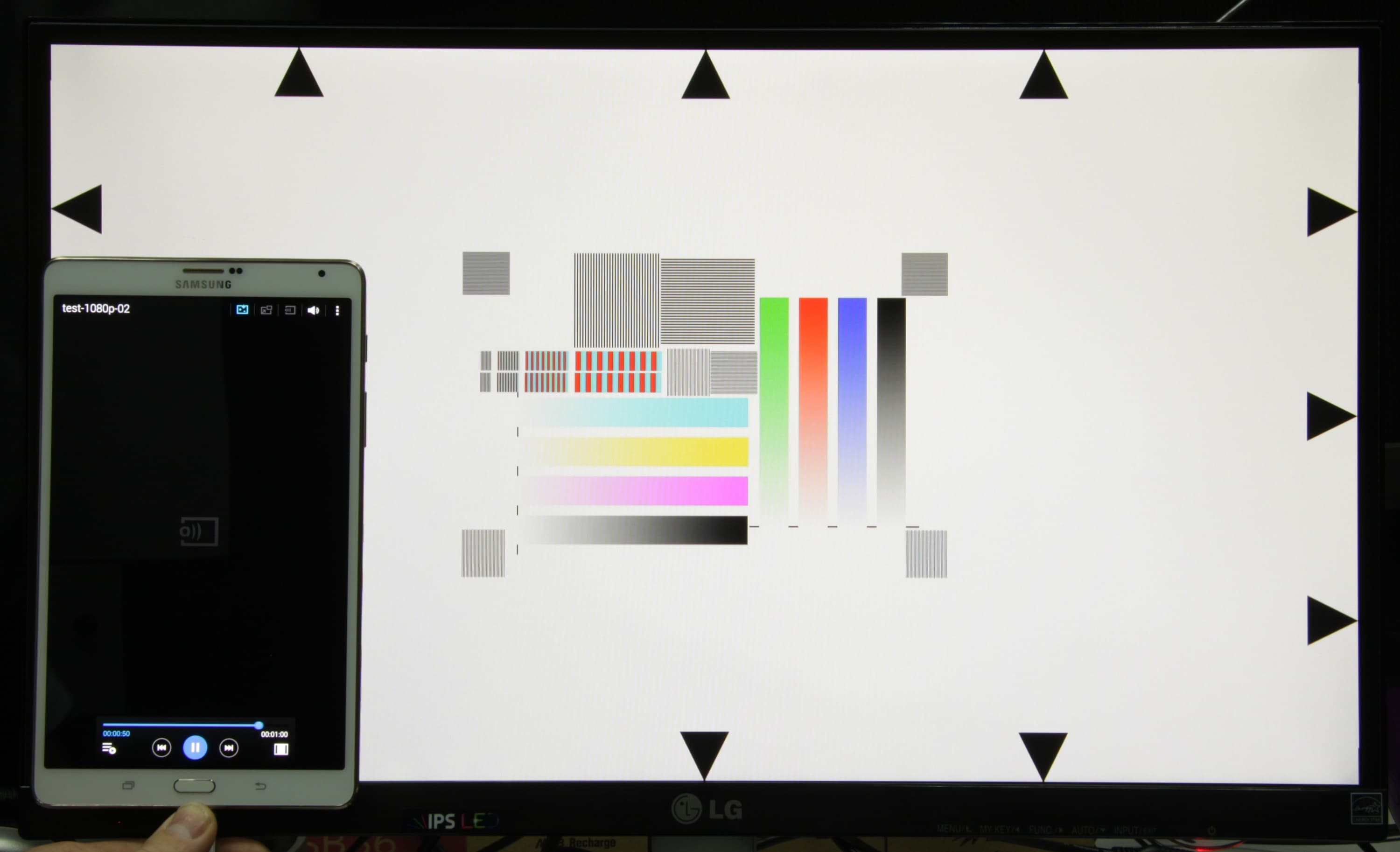 Особого описания заслуживает вывод видео. Для начала с помощью набора тестовых файлов с перемещающимися на одно деление за кадр стрелкой и прямоугольником (см. «Методика тестирования устройств воспроизведения и отображения видеосигнала. Версия 1 (для мобильных устройств)») мы проверили, как видео выводится на экран самого планшета Samsung Galaxy Tab S 8.4. Снимки экрана с выдержкой в 1 с помогли определить характер вывода кадров видеофайлов с различными параметрами: варьировались разрешение 1280 на 720 (720p) и 1920 на 1080 (1080p) пикселей и частота кадров 24, 25, 30, 50 и 60 кадр/с. В этом тесте мы использовали видеоплеер MX Player в режиме «Аппаратный+». Результаты этого (блок, озаглавленный как «Экран планшета Samsung Galaxy Tab S 8.4») и следующего теста сведены в таблицу:
