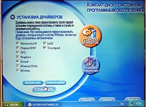 Поскольку это первый ноутбук от Samsung, побывавший на наших тестах, остановлюсь на возможностях восстановления системы. В комплект входят два диска CD восстановления системы и System Software CD. Первый из них содержит русскую версию операционной системы Windows XP professional. Диск загрузочный, при его использовании происходит штатная установка системы. Второй диск содержит драйвера и утилиты. Драйвера можно устанавливать как по отдельности, так и «комплектом».