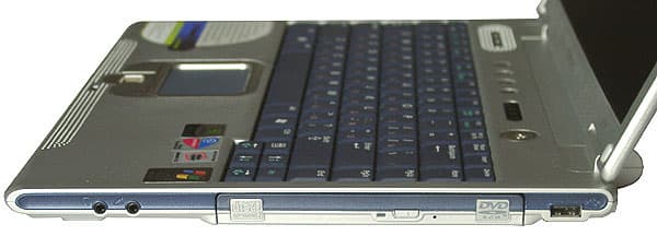 Справа аудиоразъемы, комбо-драйв и еще один порт USB. Он задвинут немного далековато, но особенных неудобств это не создает. И уж конечно такое расположение лучше «стандартного» на заднем торце.