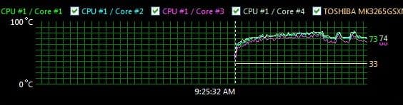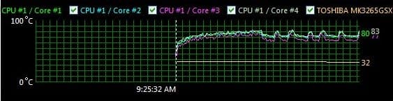 Частота мгновенно скакнула сразу до 2,6 ГГц. При этом тест нагружает все ядра процессора, т. е. если бы задача была однопоточной, рост частоты мог бы быть и больше. Но и температура процессора начала расти быстрее, чем на других ноутбуках. Вентилятор постепнно включается на все более высокие скорости. Температура быстро (где-то две минуты) добралась до критической — 83 градуса по данным мониторинга. После этого система начала сбавлять обороты: множитель стал 25, но время от времени пытается вернуться обратно на 26.