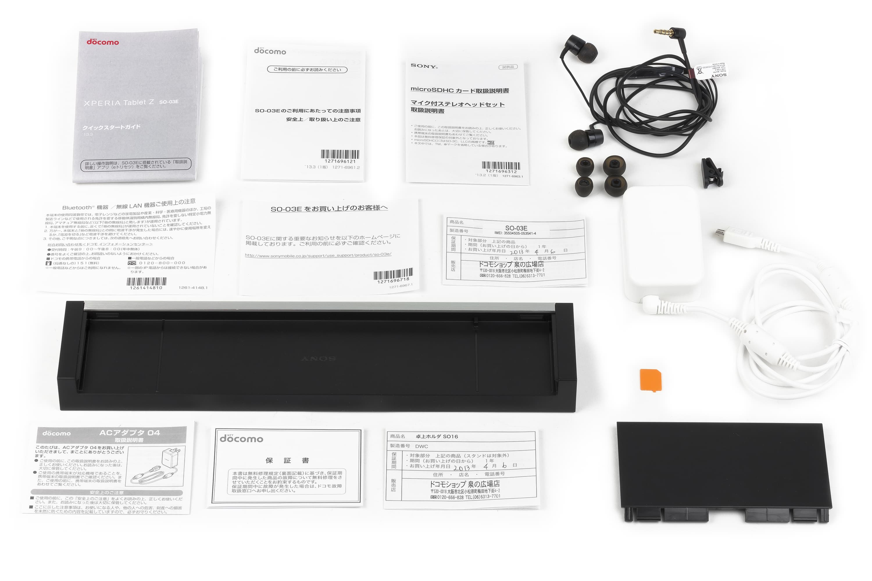 Коробка выглядит простовато и невзрачно, хотя и нельзя сказать, что плохо. Большинство надписей на коробке по очевидным причинам выполнены на японском. Внешняя скромность упаковки компенсируется отличной комплектацией. В нее входят: док-станция для планшета, набор мини-буклетиков и листовок (в нашем случае — все на японском), наушники с набором насадок и клипсой, а также зарядное устройство (с вилкой американского типа).