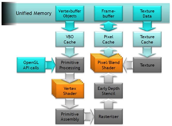 Конвейер графического ядра NVIDIA Tegra и Tegra 2 схож со стандартным конвейером, описанным спецификациями OpenGL 2.0, но имеет некоторые оптимизации для увеличения производительности. Так как компания NVIDIA является одной из лидирующих компаний на рынке графических решений, немудрено, что GeForce GPU в системах Tegra имеет много общего с настольными архитектурами компании недавнего прошлого, но мобильная версия специально доработана для того, чтобы потреблять как можно меньше энергии. Для этого применено улучшенное управление питанием с несколькими уровнями динамического изменения частоты и напряжения, а также отключения простаивающих блоков.