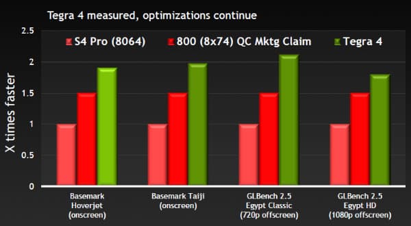 NVIDIA приводит некоторые данные графической производительности для сравнения их Tegra 4 с уже существущими на рынке решениями, имеющими мощные GPU-ядра Qualcomm, ARM и PowerVR. Эффективность данных GPU предлагается оценить как по теоретическим параметрам производительности видеоядер (филлрейт и вычислительная производительность), так и по одному из общепринятых 3D-бенчмарков — GLBench 2.5.