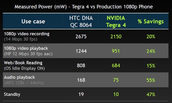 Вполне естественно, что улучшения эффективности всех блоков в семействе Tegra 4 сказались и на экономичности и эффективности системы целиком. Еще одним сравнением со смартфоном HTC DNA на базе топового решения Qualcomm NVIDIA решила показать выгоду в экономичности. Tegra 4 (и это старшее решение), по измерениям компании, является однокристальной системой, потребляющей меньше энергии, чем любая из существующих топовых. Вот это самое сравнение с конкурентом: