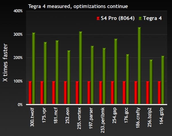 Тесты SPECint2000, показанные выше на диаграмме компании, используют алгоритмы, схожие с теми, что применяются в приложениях навигации, распознавания трехмерных объектов, в текстовом поиске, обработке текстовых данных, Java-приложениях, игровой логике и сжатии данных. Соответственно, можно оценить производительность NVIDIA Tegra 4 по сравнению с системой Qualcomm S4 Pro APQ8064, имеющей четыре ядра Krait, работающие на частоте 1,7 ГГц.