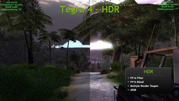 Вообще, по словам представителей NVIDIA, из всех особенностей OpenGL ES 3.0 новыми видеоядрами серии Tegra 4 не поддерживаются только точность вычислений FP32 в пиксельных шейдерах и формат сжатия ETC2. Тем не менее, это не позволяет поставить в спецификациях соответствующую галочку. Зато NVIDIA уверяет, что они первыми поддерживают все возможности, необходимые для реализации полноценного HDR-рендеринга в мобильных решениях: фильтрация FP16 и блендинг, а также MRT и sRGB — о некоторых из этих возможностей вы можете помнить по десктопным решениям — они начали применяться со времен Far Cry.