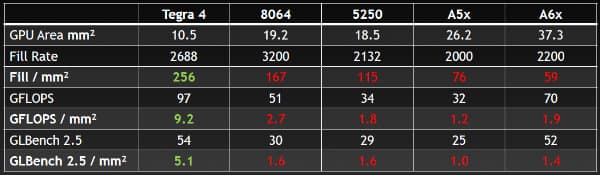 Все площади GPU даны по оценке NVIDIA и приведены (простой нормализацией) к техпроцессу 28 нм. По филлрейту топовое решение NVIDIA несколько уступает лучшему из конкурентов в абсолютных цифрах, но значительно выигрывает в эффективности. Еще бо́льшая разница есть в вычислительной производительности — тут Tegra 4 впереди как в абсолютном зачете, так и по эффективности. Что касается синтетического бенчмарка, то и в нем NVIDIA отмечает большой отрыв своего решения. Все эти цифры гораздо нагляднее выглядят на диаграмме: