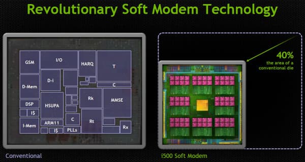 NVIDIA утверждает, что архитектура SDR позволяет загружать в чип и использовать специальные профили для стран и городов с разными мобильными сетями и за счет этого получать преимущество в эффективности. Они считают, что применение программируемого модема Icera выгоднее обычных модемов с поддержкой LTE, используемых другими производителями. В случае с обычными модемами поддержка сетей 3G, 4G и т. д. обеспечивается выделенными блоками, и некоторые их части дублируются в разных областях чипа, а программируемый чип Icera способен использовать свои восемь программируемых процессоров при работе с любым стандартом беспроводных сетей. По данным NVIDIA, их решение эффективнее и примерно на 40% меньше обычных модемных чипов по площади.