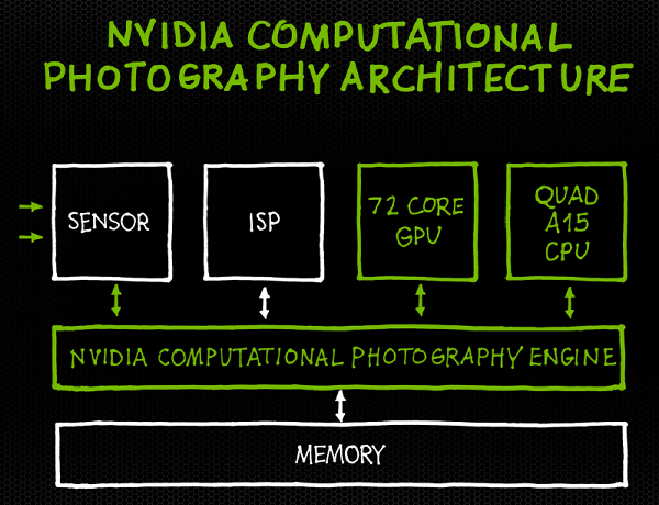 NVIDIA Computation Photography Engine отличается тем, что способен одновременно обеспечивать доступ к данным с сенсора для всех ядер CPU и GPU, а также для сопроцессора по обработке изображений ISP, чтобы значительно ускорить обработку снимков, в том числе и при фотосъемке в расширенном динамическом диапазоне. Причем в случае с Tegra 4 два снимка с разной экспозицией делаются одновременно (см. две стрелочки, направленные в сенсор).