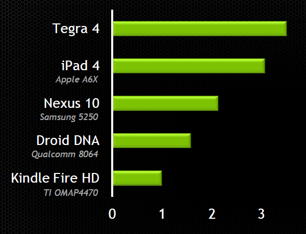 Мы сейчас говорили о скорости CPU-части, а про GPU известно еще меньше — даже теоретических тестов публично еще никто не показывал. Известно, что 72-ядерный GeForce GPU разработан специально для мобильной системы-на-чипе Tegra 4 и включает многочисленные разработки из настольных поколений графических процессоров компании, в том числе из Kepler. Но о производительности GPU-ядра можно пока судить лишь по очень примерным оценкам NVIDIA — они полагают, что Tegra 4 в теории до шести раз быстрее, чем Tegra 3.