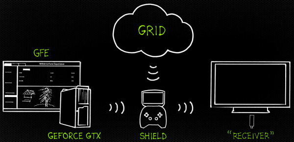 В общем, у NVIDIA получилось нечто вроде домашнего «облачного» игрового сервиса с блэкджеком и…, когда кадр рендерится на большом ПК, стоящем где-то в углу или вообще в бытовом помещении: специальное программное обеспечение в составе GeForce Experience отрисовывает картинку на настольном GPU и передает ее по беспроводному Wi-Fi-соединению на экран устройства отображения и на Shield одновременно. А консоль NVIDIA в данном случае служит просто беспроводным игровым контроллером, команды от которого по Wi-Fi передаются на ПК.