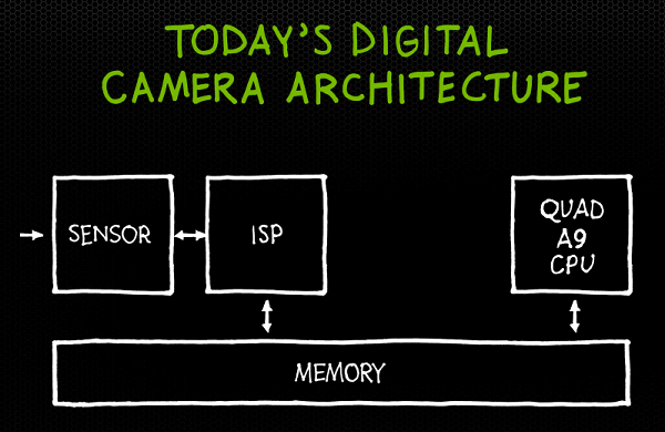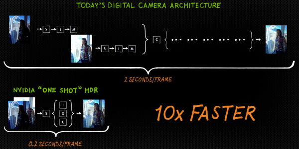 Природа артефакта понятна — ведь объединяются два кадра, сделанные не одновременно. И процесс HDR-съемки — одно из тех применений, которые можно улучшить, радикально ускорив время обработки. Но чем отличается подход NVIDIA от того, что делается в нынешних устройствах? На данный момент обработкой фотографий занимается специальный сопроцессор обработки сигналов (ISP), который считывает информацию с сенсора и только после обработки записывает в память для дальнейших вычислений на CPU.