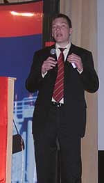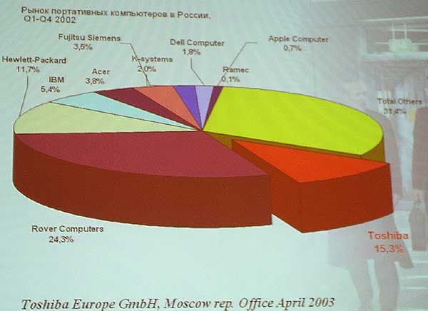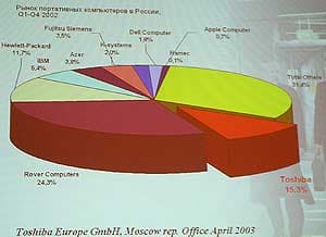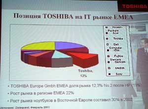 Далее г-н Александр Бурсач, генеральный менеджер Toshiba по странам СНГ, рассказал о позиции и перспективах компании на рынке EMEA. По итогам 2002 года Toshiba занимает второе место, уступая лишь компании Hewlett-Packard, которая после объединения с Compaq вполне логично вышла в лидеры.