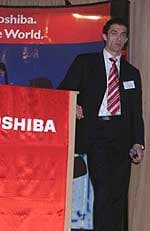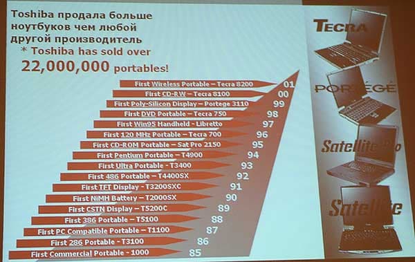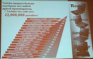 В приветственном слове глава Московского представительства Toshiba г-н Эндо отметил, что на общем фоне рынок портативных компьютеров в целом и в регионе EMEA в частности растет. Касаясь итогов 2002 года, представитель компании отметил, что продажи в 2002 году по сравнению с 2001 годом выросли в 2.5 раза. В то же время, появление на рынке новых игроков (iRu, MaxSelect, Samsung) и диверсификация спроса не позволяют останавливаться на достигнутом. Для удовлетворения постоянно возрастающих потребностей клиентов в опциях и аксессуарах для портативных компьютеров, 1 апреля в Москве начала свою деятельность компания Toshiba Digital Media Networks CIS, дочерняя компания Toshiba Corporation, Tokyo. Компания будет осуществлять отгрузку аксессуаров со склада в Москве, что даст возможность удовлетворить запросы клиентов в кратчайшие сроки. От себя замечу, что эта компания не будет заниматься продажами собственно ноутбуков, ее специализация опции и аксессуары.