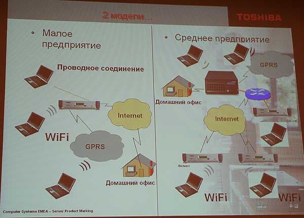 В настоящее время, по мнению Toshiba, настал период перехода от продуктов к решениям. Миссия Toshiba в настоящее время создание мобильного стиля жизни. В этом позиция Toshiba совпадает с позицией Intel, представившей на рынок новую платформу Centrino. На сегодняшний день эта технология, позволяющая снизить массу компьютера, улучшить производительность и увеличить время работы от батарей, используется компанией Toshiba в моделях серий Tecra, SatellitePro и Portege. Кроме того (я, честно говоря, об этом просто не задумывался), компания выпускает и серверы, позволяющие строить беспроводные сети, а также уделяет большое внимание обеспечению безопасности таких сетей. Вот так приблизительно должна выглядеть работа в представлении Toshiba.