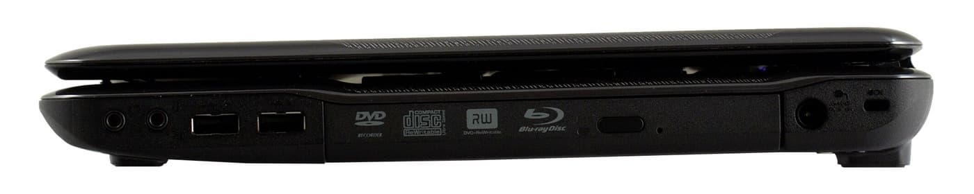 Разъем питания расположен на правой грани. Сам штекер прямой, торчит примерно на 3 см, дальше идет обычный провод. Рядом с проводом питания расположен разъем для замка Кенсингтона. Чуть ближе к переднему краю находится оптический привод, далее идут два порта USB и два аудиоразъема, выход на наушники и микрофонный вход. При подключении штекера драйвер предлагает выбрать, активировать профиль наушников или линейного выхода.