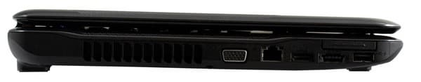 На левой грани расположена выхлопная решетка вентиляции, достаточно большая по размерам. Рядом, ближе к передней грани, расположены выход VGA, разъем проводной сети, выход HDMI, комбинированный выход eSATA/USB, еще один порт USB, а также слот Expresscard 34.