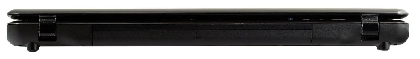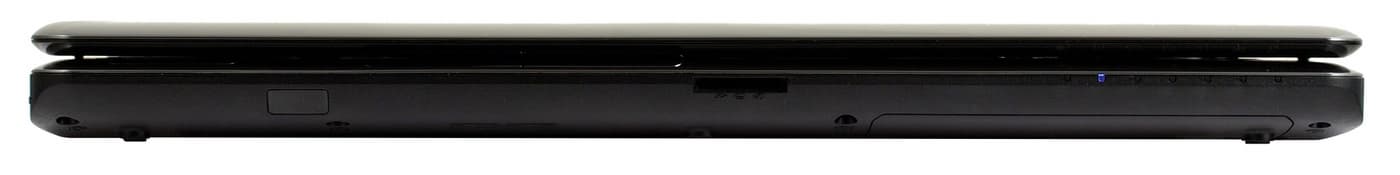 На передней грани также нет разъемов, только окошко ИК-порта (для работы с пультами дистанционного управления) и картовод (неопрятная дырка на передней части выглядит, как широкая щель). В правой части передней грани расположены все системные индикаторы, причем диоды направлены строго вперед.