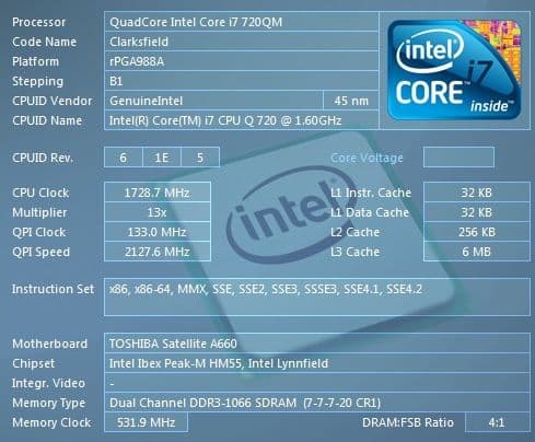 Процессор i7 720 (Clarksfield). Как вы помните, номинальная частота процессора составляет 1,6 ГГЦ, однако в случае сильной нагрузки и при соблюдении определенных условий процессор может поднимать свою частоту. Это тоже можно вносить беспорядок в результаты тестов.