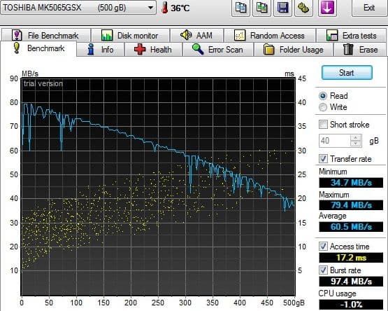 Скорость чтения очень близка к показанным результатам, время разнится, но оно прыгало и там, и там, как раз в указанных интервалах: между 16,5 и 17,5 мсек. В целом, современные жесткие диски быстрые, и повседневной офисной работе их вполне должно хватать.