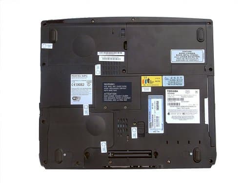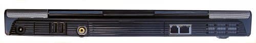 На задней панели тоже достаточно много разъемов. Кстати, менее часто используемые разъемы вывода на монитор и LPT закрыты крышкой. Помимо них слева направо находятся: разъем питания (разъем стандартный, но напряжение и сила тока «особенные»), два вертикально расположенных слота USB, видеовыход (ноутбуки Toshiba традиционно оснащаются выдеовыходами RCA, а не широко используемым другими производителями S-Video), сблокированные модемный и сетевой разъемы и неизменная решетка системы вентиляции.