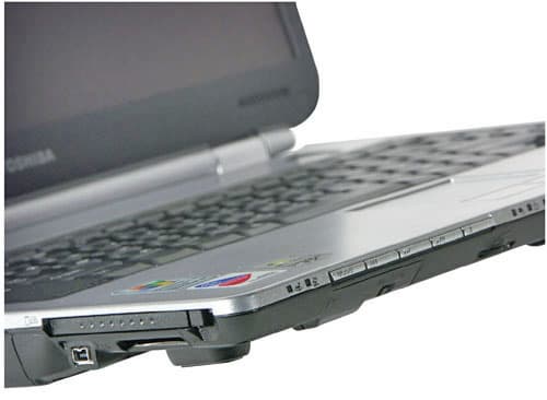 Итак, для начала давайте рассмотрим расположение разъемов. На передней панели не так уж много портов: ИК порт (вот уж чего вполне можно было бы избежать), механический выключатель беспроводной связи, традиционный для Toshiba регулятор громкости в виде колесика, да вынесенные на торец кнопки управления аудиоплеером. Тут нужно отметить, что передняя панель скошена к низу почти под 45 градусов, поэтому пользоваться, например, регулировкой громкости очень и очень неудобно — более-менее толстый палец элементарно застревает между поверхностью стола и скосом, и не достает до регулировки.