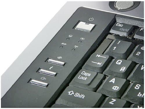 М30 имеет три традиционных дополнительных клавиши — запуск Интернет-обозревателя, утилиты управления Toshiba console и быстрого включения вывода изображения на внешний монитор. А также 4 индикатора, светящихся синим (верхний ряд) и желтым (нижний) светом. В кнопку питания встроен светодиод, горящий ярко-синим при работе ноутбука. Решение, надо сказать, привлекающее взгляд, но не очень продуманное, так как ночью светящийся светодиод слишком яркий и отвлекает от экрана.