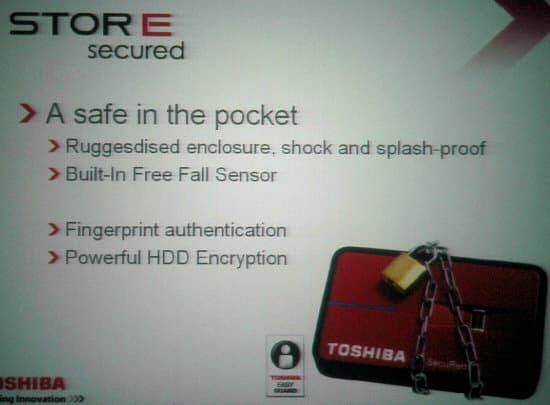 Контейнеры от Toshiba имеют целый ряд черт, выгодно отличающих их от конкурентов. Во-первых, они отличаются высокой степенью защищенности. У них очень крепкий корпус с резиновыми вставками — поэтому если диск упадет, то удар не будет жестким. В дисках используется датчик ускорения, который запаркует головки, если диск упадет во включенном состоянии. Наконец, последняя важная составляющая – все диски оснащены системой шифрования данных на основе сканера отпечатка пальцев.