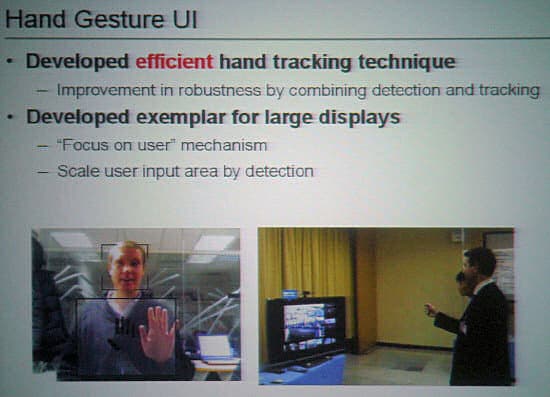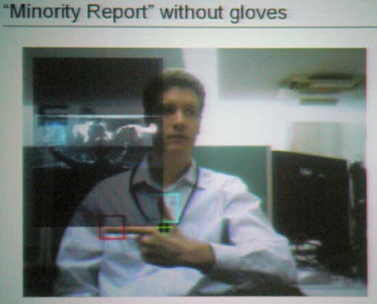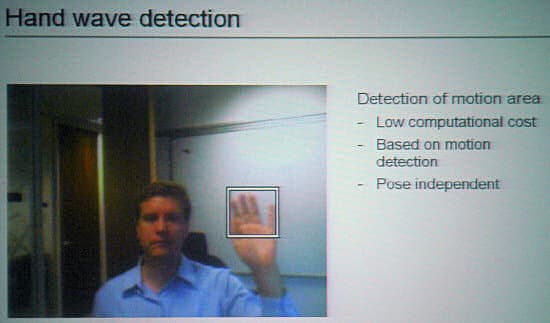 Система очень интересная. Она способна распознавать руку пользователя (выделяя ее на получаемом с камеры изображении), отслеживает ее передвижения по экрану и распознает жесты, через которые осуществляется управление. Система даже способна определить руку, которой осуществляется управление, и не отвлекаться на другие руки в кадре. Причем он может узнавать руку в сложных условиях (например, выделить ее в условиях не очень хорошего освещения на фоне из книг с обилием разных цветов и теней и т.д.).