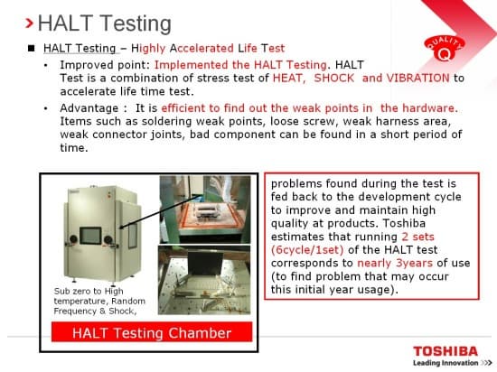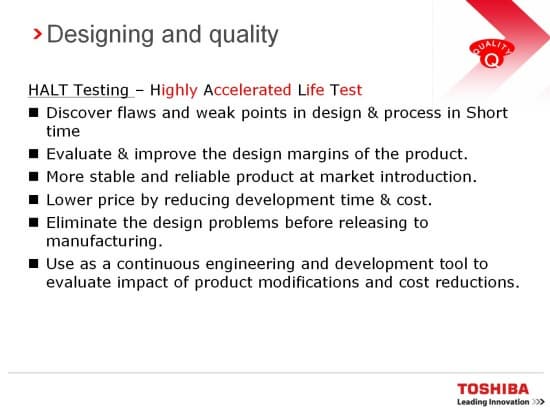 Кстати, отдельно стоит упомянуть о технологии тестирования продуктов. Toshiba проводит ряд тестов, направленных на оценку стабильности поведения продукта в различных условиях. На первом слайде указаны основные цели тестирования.