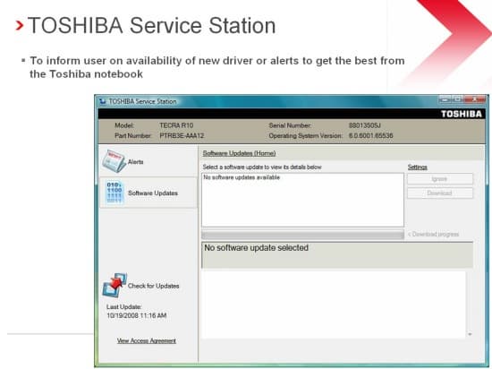 Утилита Toshiba Service — менеджер апдейтов, который позволяет обновлять драйвера и утилиты ноутбука практически в автоматическом режиме.