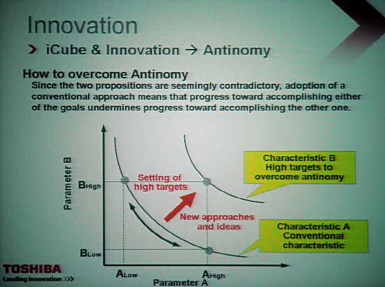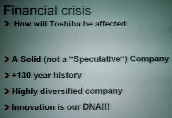 Презентациям был отведен практически весь второй день, причем они были посвящены не только технологическим анонсам новой продукции, но и рассказам о стратегии поведения и развития Toshiba в текущей экономической ситуации.