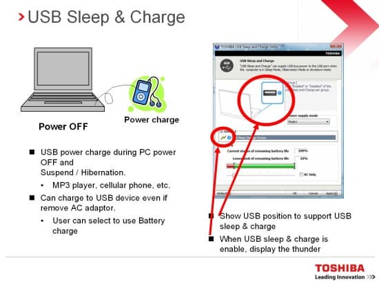 Во-первых, Toshiba представила USB sleeping charge. Даже если система выключена, она все равно может заряжать через USB мобильные устройства, например, сотовый телефон или плеер. Это может быть удобно для мобильных пользователей.