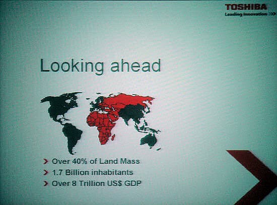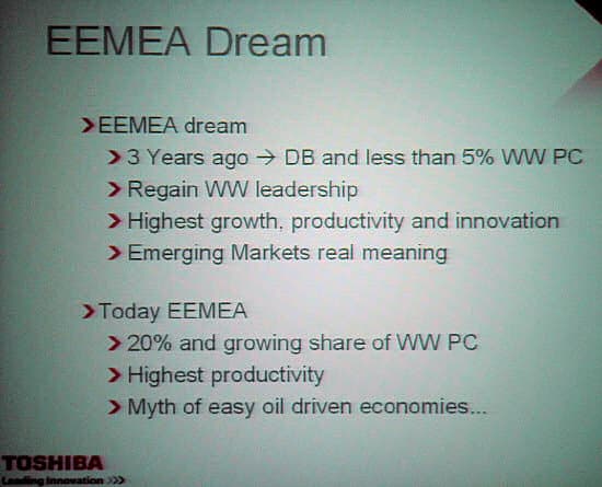 Первым выступал вице-президент по маркетингу Toshiba Europe GMBH по развивающимся рынкам (emerging markets), Питер Пол Икс (Pieter Paul Ickx). Кстати, на этом слайде показано, какие именно регионы относит в эту группу компания.