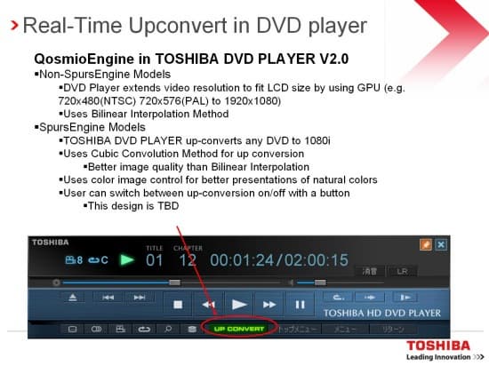 Эта функция реализована в программном плеере Toshiba. В будущем она, возможно, появится и в бытовых плеерах Toshiba, вместе с процессором QuadCore.