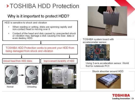 Если ноутбук начинает падать, система быстро паркует головки жесткого диска. Система работает со специальной утилитой, которая показывает состояние диска и, в частности, в этой утилите можно настроить чувствительность, чтобы избежать случайного срабатывания датчика. Кроме того, вокруг ноутбука есть специальный амортизирующий каркас, который тоже защищает его.
