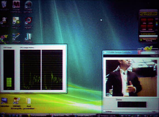 Стоит отметить, что система распознавания требует достаточно много аппаратных ресурсов. Для устойчивой работы системы, Toshiba использует специализированный мультимедийный процессор, HD Quadcore. Это четырехядерный процессор, который берет на себя некоторые задачи, одна из них как раз — распознавание жестов. При этом задача достаточно ресурсоемкая — она загружает специализированный процессор и поднимает загрузку ЦП с 4% до 24% (ноутбук — новый и мощный Qosmio). В правом верхнем углу диаграмма загрузки QuadCore (процессор загружен на 100%), слева загрузка ЦП.