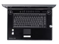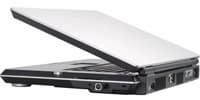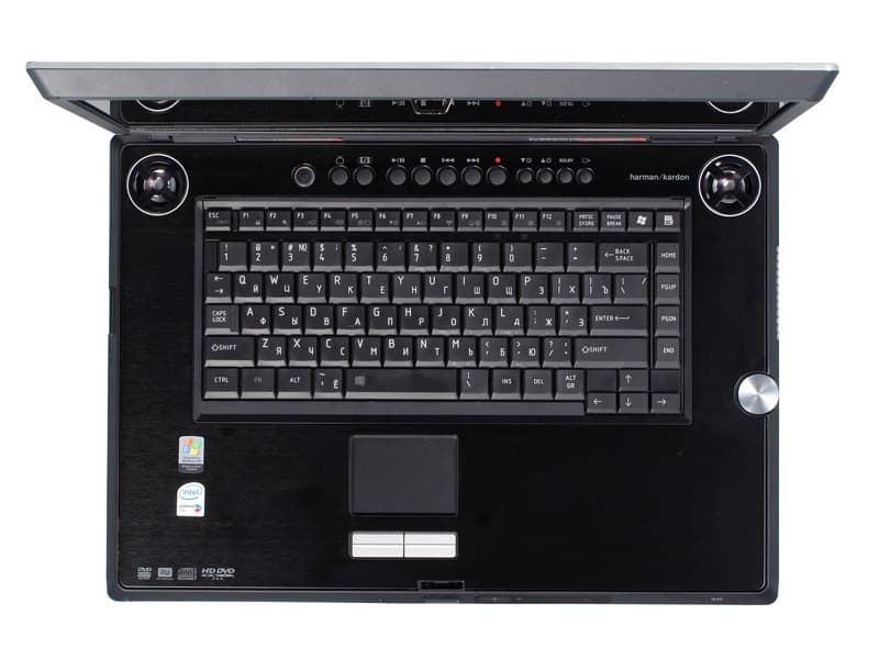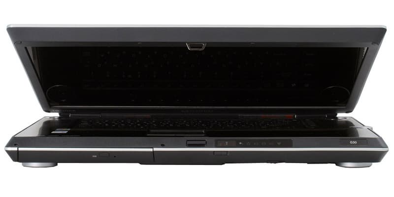 При открытой крышке ноутбук выглядит достаточно интересно. Есть большое сходство с моделью Q20, но есть и отличия. Самое существенное — это использование металла вместо пластика для верхней панели, что заметно добавляет «солидности». Другие моменты менее существенны: для управления медиапроигрывателем над клавиатурой теперь используются именно кнопки, а не сенсорные датчики, регулятор громкости потерял индикатор уровня и некоторые индикаторы (в частности, активности жесткого диска и беспроводного соединения) переехали в общий блок на передний торец устройства.