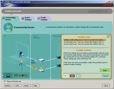 При возникновении проблем с сетевыми соединениями на помощь придет Connectivity Doctor, входящая в состав ConfigFree. Эта программа позволяет наглядно проверить настройки всех сетевых устройств и обнаружить проблему. Еще одной программой, входящей в комплект, является SUMMIT. Она позволяет использовать «виртуальные конференции» среди ПК с аналогичным программным обеспечением, в которых можно общаться в чате и пересылать файлы. К сожалению, использованная во время тестов версия ConfigFree была только частично локализована.