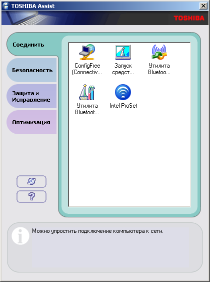 Большинство утилит для удобства запуска сосредоточены в оболочке Toshiba Assist (консоль). Она имеет четыре закладки: