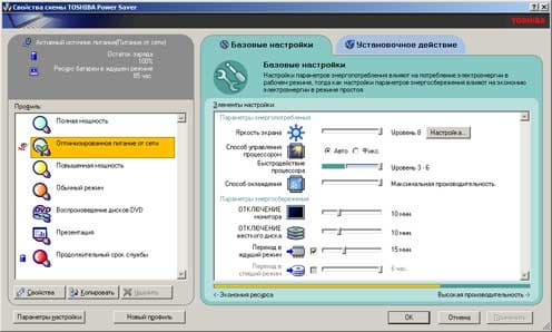 Производители ноутбуков часто комплектуют свои изделия специализированными программами для управления энергопотреблением. Не стала исключением и Toshiba, установив на G30 свою программу Power Saver. Она предлагает более интересные возможности по сравнению со стандартной программой операционной системы. В частности, используются такие настройки как яркость экрана (в том числе и с зависимостью от уровня заряда батареи), управление быстродействием центрального процессора и системой охлаждения, отключение дополнительных устройств. Кроме того, расширены и возможности оповещения о низком заряде батарей. В базовой поставке используются семь профилей, и есть возможность создавать свои, в том числе и на основе готовых.
