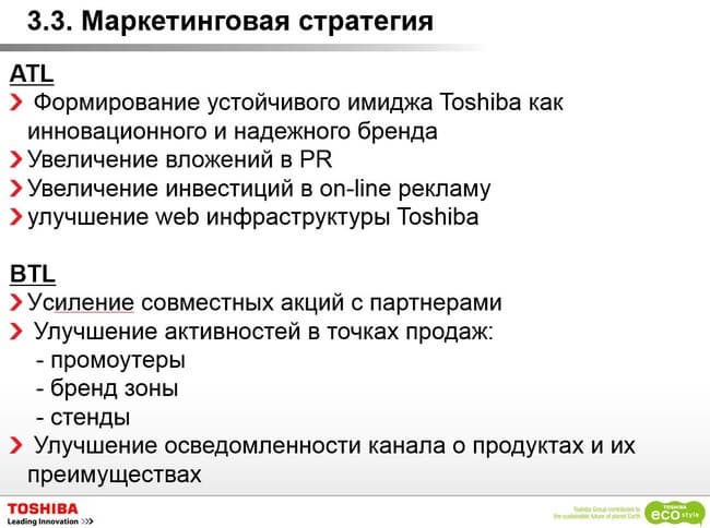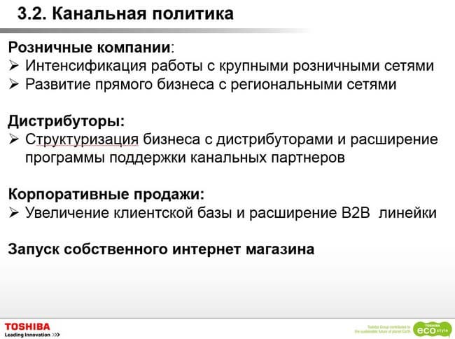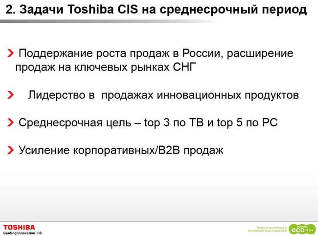 Первая цель вполне своеобычна. А вот вторая интересна именно с точки зрения стратегии: Toshiba отказывается от массовости и продвижения товара за счет низкой цены, собираясь использовать такие козыри, как технологичность (не использование самых новейших технологий в продуктах-флагманах, а скорее использование более широкого спектра современных и актуальных технологий во всех линейках продуктов) и качество (настоящее японское качество).